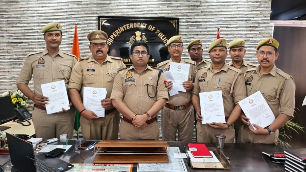 पुलिस अधीक्षक संतकबीरनगर *श्री संदीप कुमार मीना* के निर्देशन में जनसुनवाई प्रणाली को सुदृढ़ बनाने और आमजन की समस्याओं के त्वरित निस्तारण के प्रति प्रतिबद्धता दिखाते हुए जनपद संतकबीरनगर पुलिस ने IGRS (Integrated Grievance Redressal System) और CM डैशबोर्ड की नवीनतम रैंकिंग में उत्तर प्रदेश में क्रमशः प्रथम व पांचवा स्थान प्राप्त किया है । इस उपलब्धि को प्राप्त करने में महत्वपूर्ण भूमिका निभाने वाले पुलिसकर्मियों के उत्साहवर्धन हेतु पुलिस अधीक्षक महोदय ने IGRS सेल/सीएम डैशबोर्ड में तैनात प्रभारी उ0नि0 श्री रजनीश राय, उ0नि0 श्री ब्रजेश सिंह तथा उनकी टीम के सदस्यों हे0का0 आदर्श श्रीवास्तव, का0 विकास यादव, का0 धनंजय शर्मा, का0 लल्लन पाल तथा हे0का0 धृष्टधुम्न सिंह, का0 चन्दन कुमार साहनी (सीएम डैशबोर्ड ) को उनकी कार्यकुशलता, समयबद्धता और गुणवत्तापूर्ण निस्तारण के लिए व्यक्तिगत रूप से प्रशस्ति पत्र प्रदान किए।